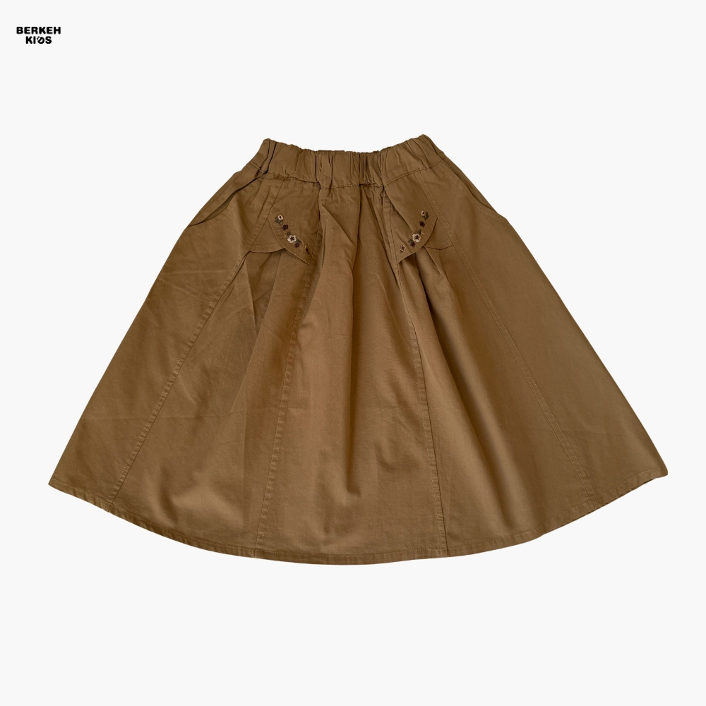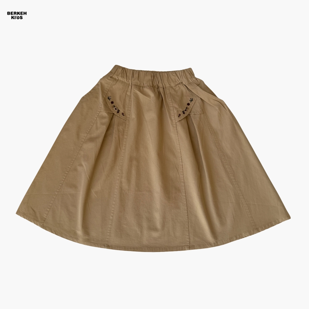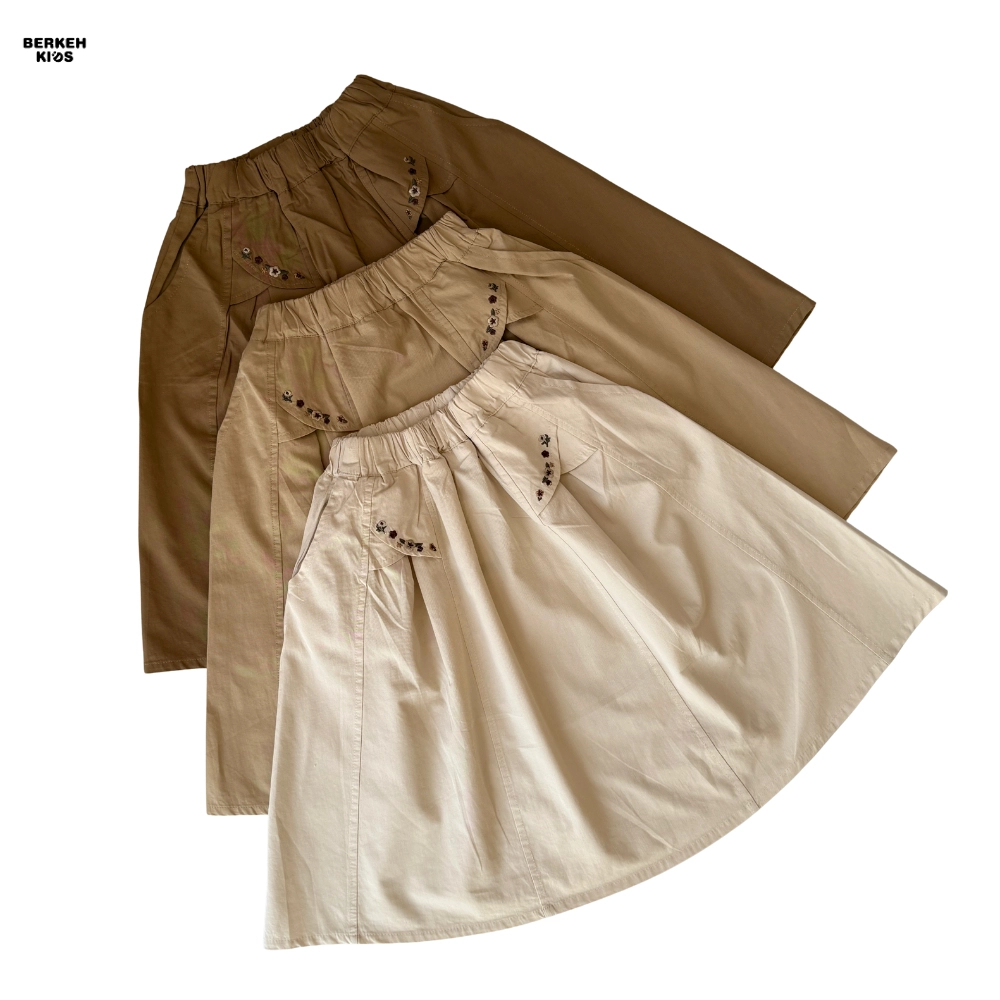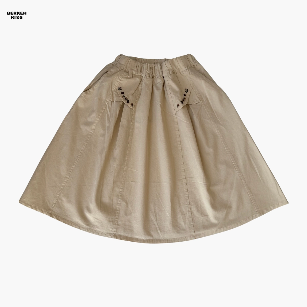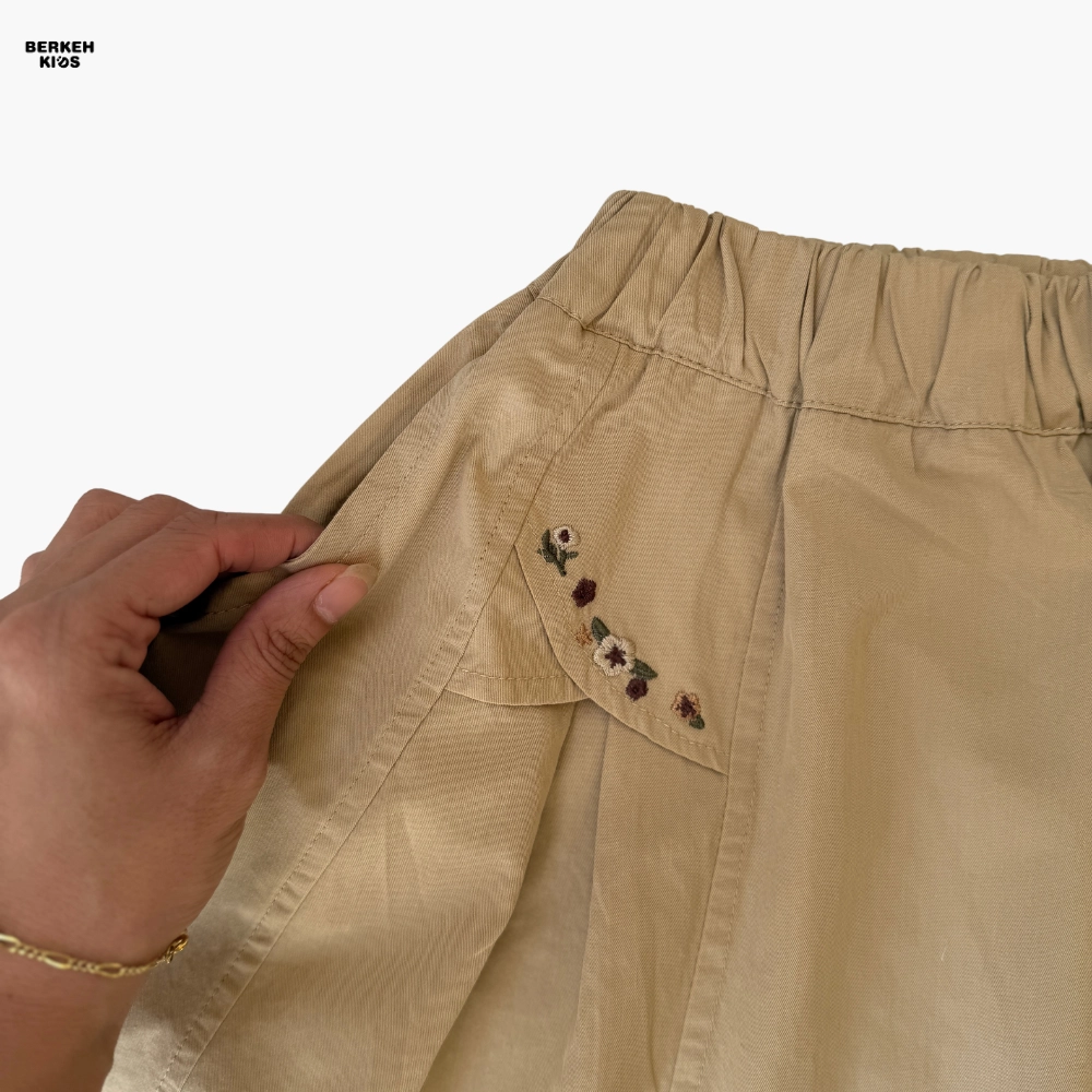 گلدوزیهای ظریف روی قسمت جیب، جذابیت این دامن را چند برابر کرده و جلوهای لطیف و دخترانه به آن میدهد. طراحی کمر کشی باعث شده پوشیدن و درآوردن آن برای کودک بسیار راحت باشد و در عین حال در ناحیه کمر بهخوبی فیت بماند.