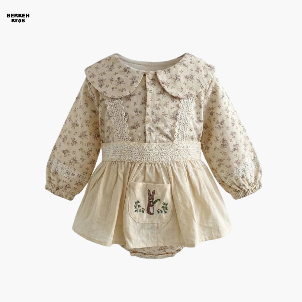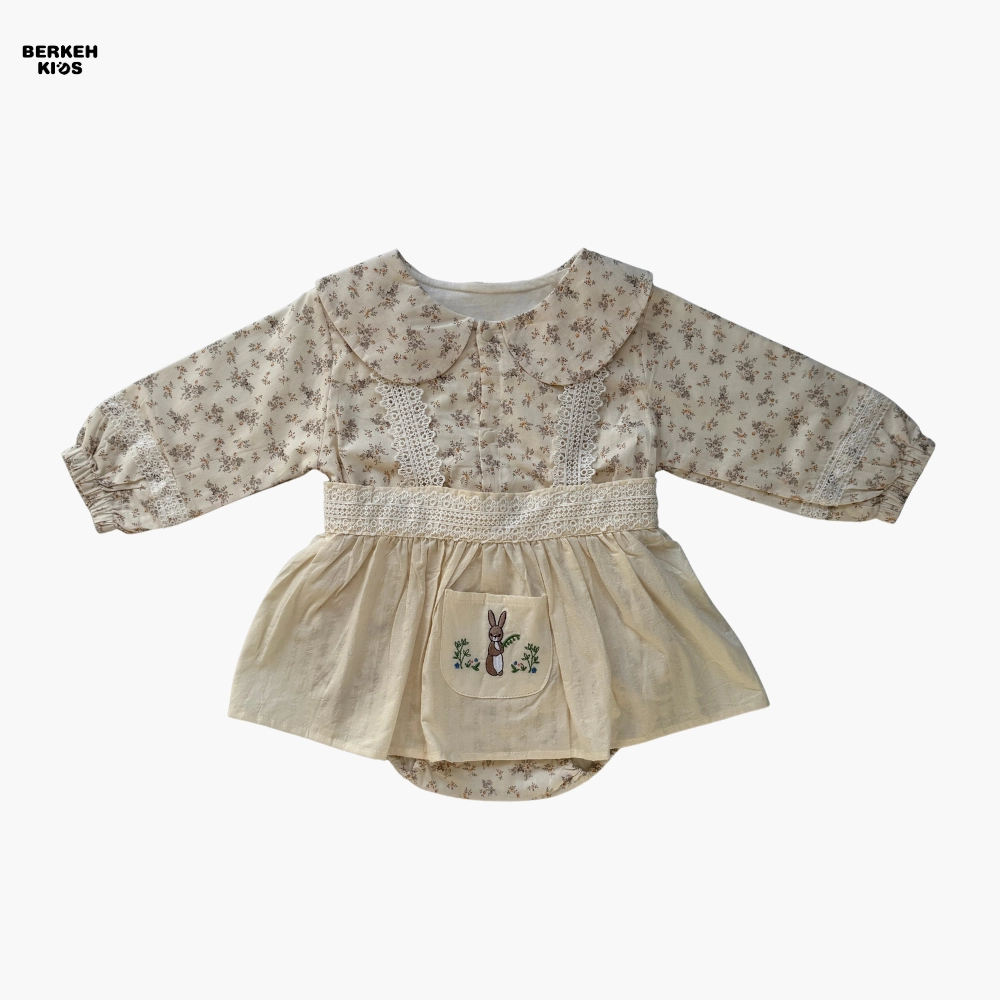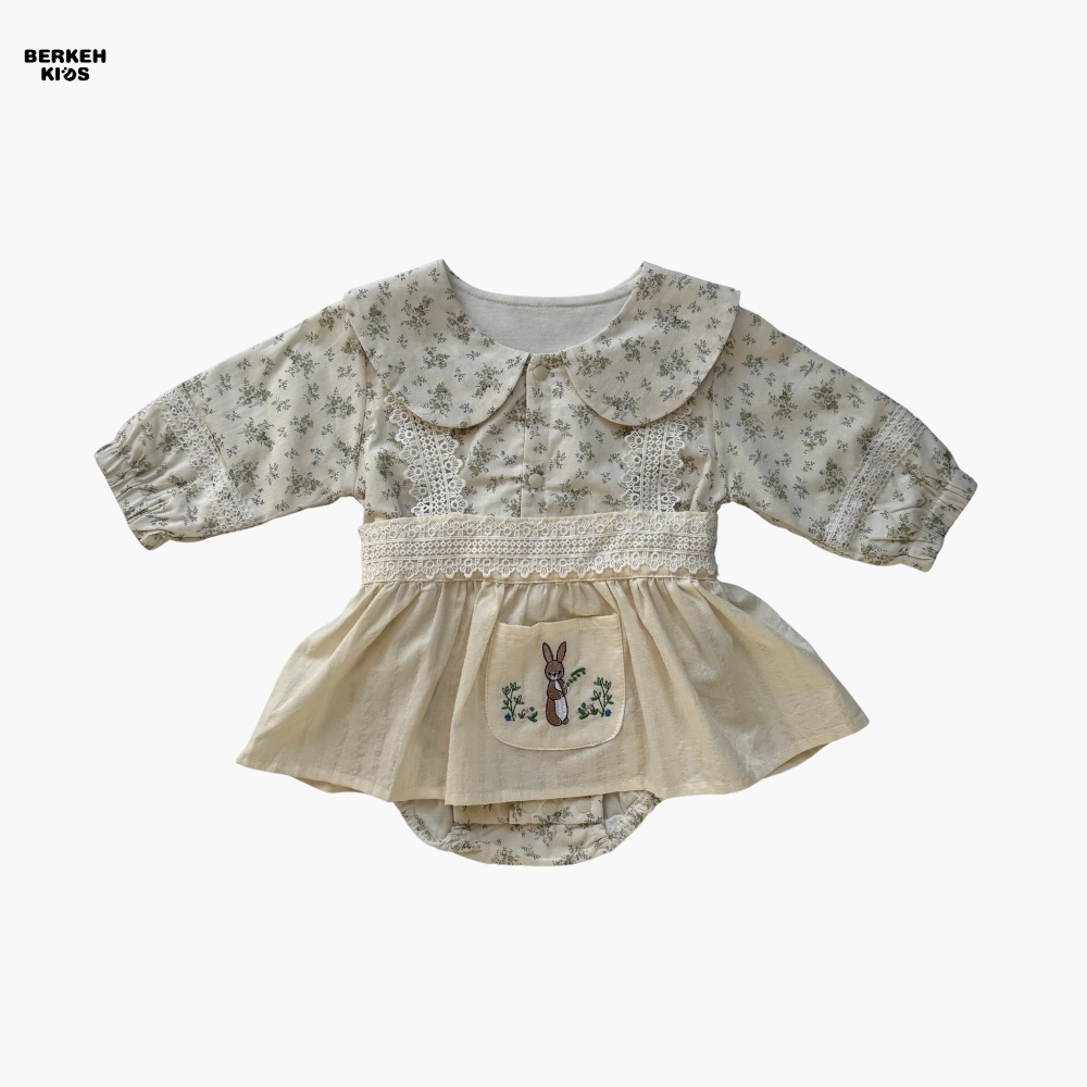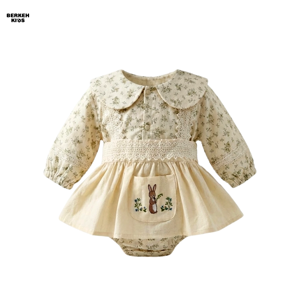 وجود یقه ب ب (Peter Pan Collar) با لبهدوزیهای توری ظریف و یک جیب کوچک با گلدوزی خرگوش، جلوهای بینظیر به این کار بخشیده است. پارچه این کار دارای طرح گلگلی بسیار ریز و ملیح است که حس لطافت دخترانه را دوچندان میکند و این بادی پیراهنی نوزادی دخترانه برای عکاسی در آتلیه گزینهای عالی محسوب میشود.