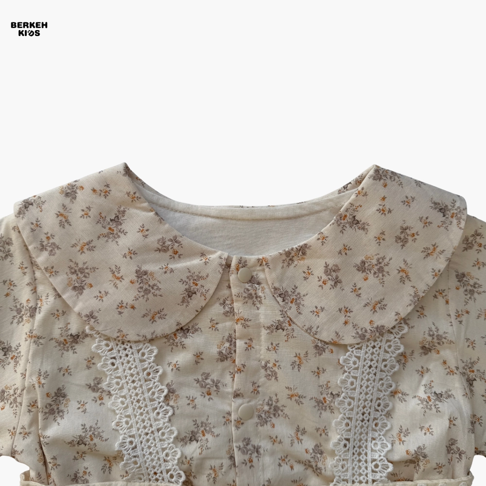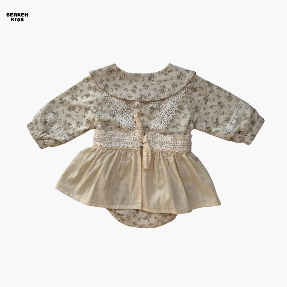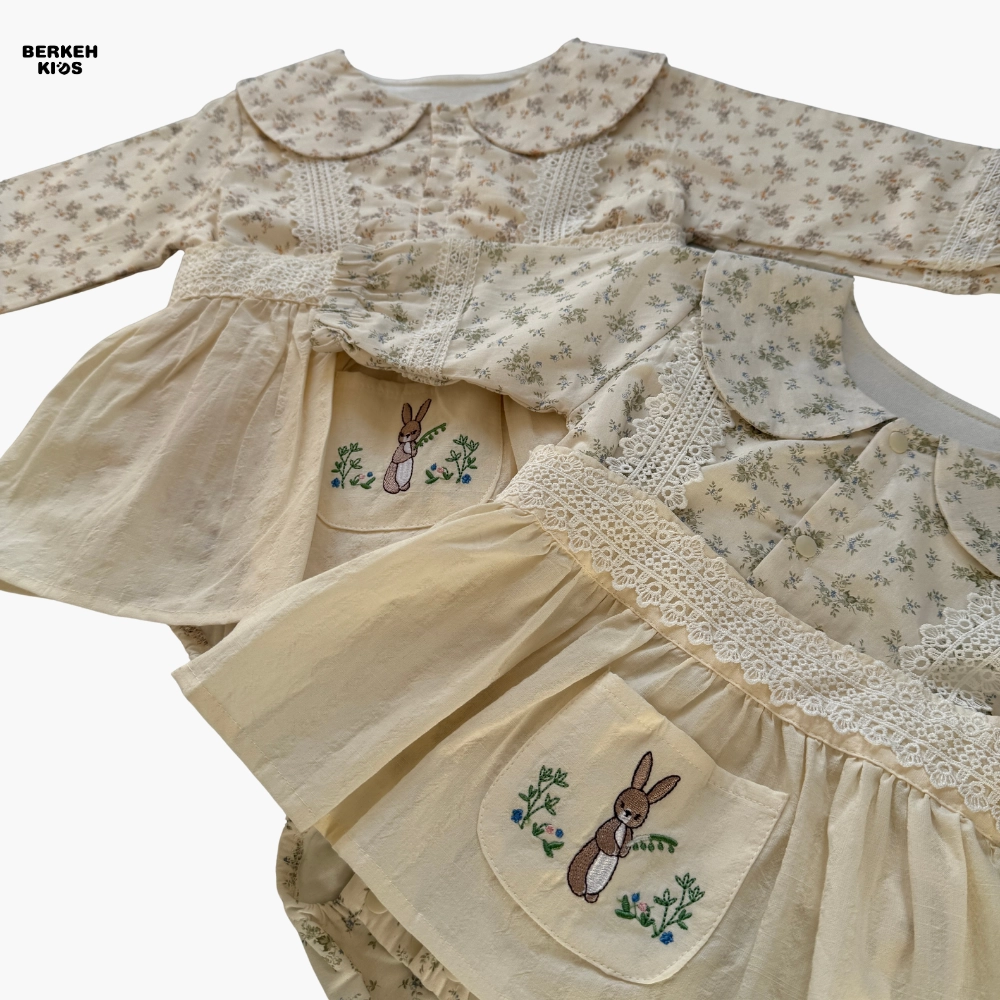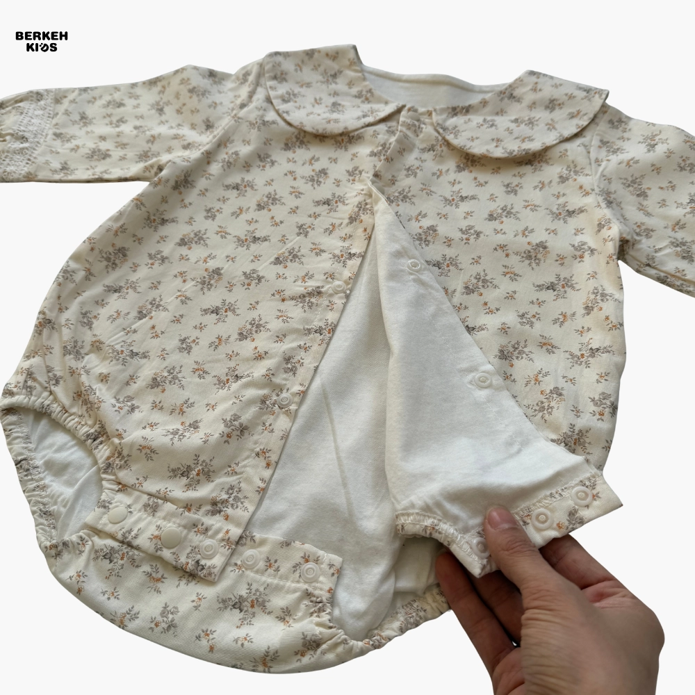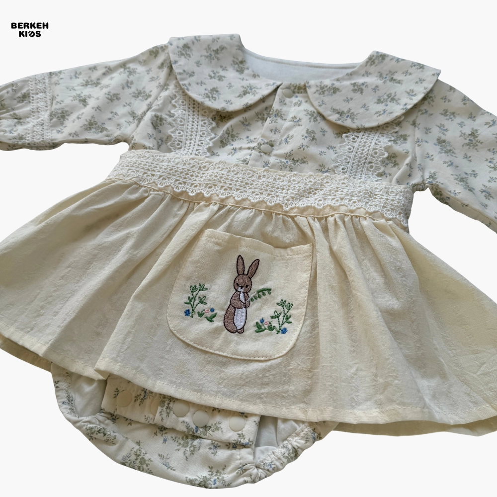 وجود یقه ب ب (Peter Pan Collar) با لبهدوزیهای توری ظریف و یک جیب کوچک با گلدوزی خرگوش، جلوهای بینظیر به این کار بخشیده است. پارچه این کار دارای طرح گلگلی بسیار ریز و ملیح است که حس لطافت دخترانه را دوچندان میکند و این بادی پیراهنی نوزادی دخترانه برای عکاسی در آتلیه گزینهای عالی محسوب میشود.