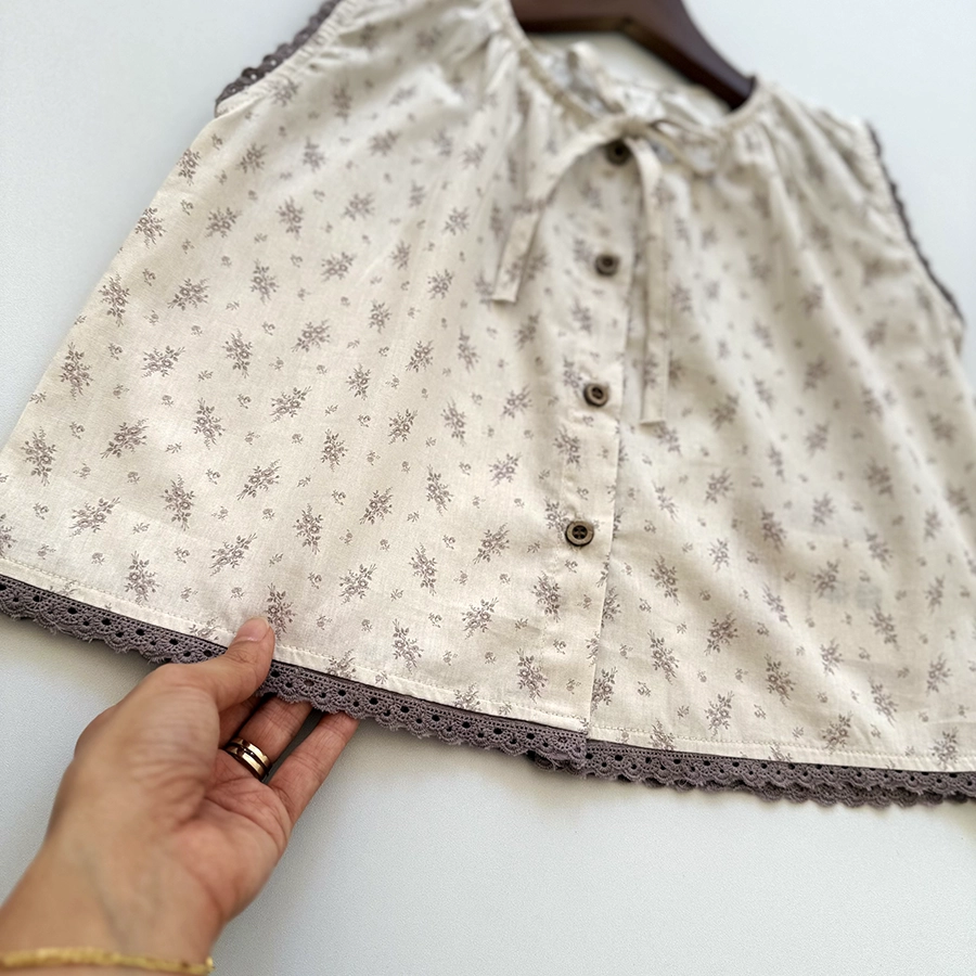 جنس: شومیز لینن با طرح گلدار ظریف که با حاشیه های توری دانتل دوزی شده است.