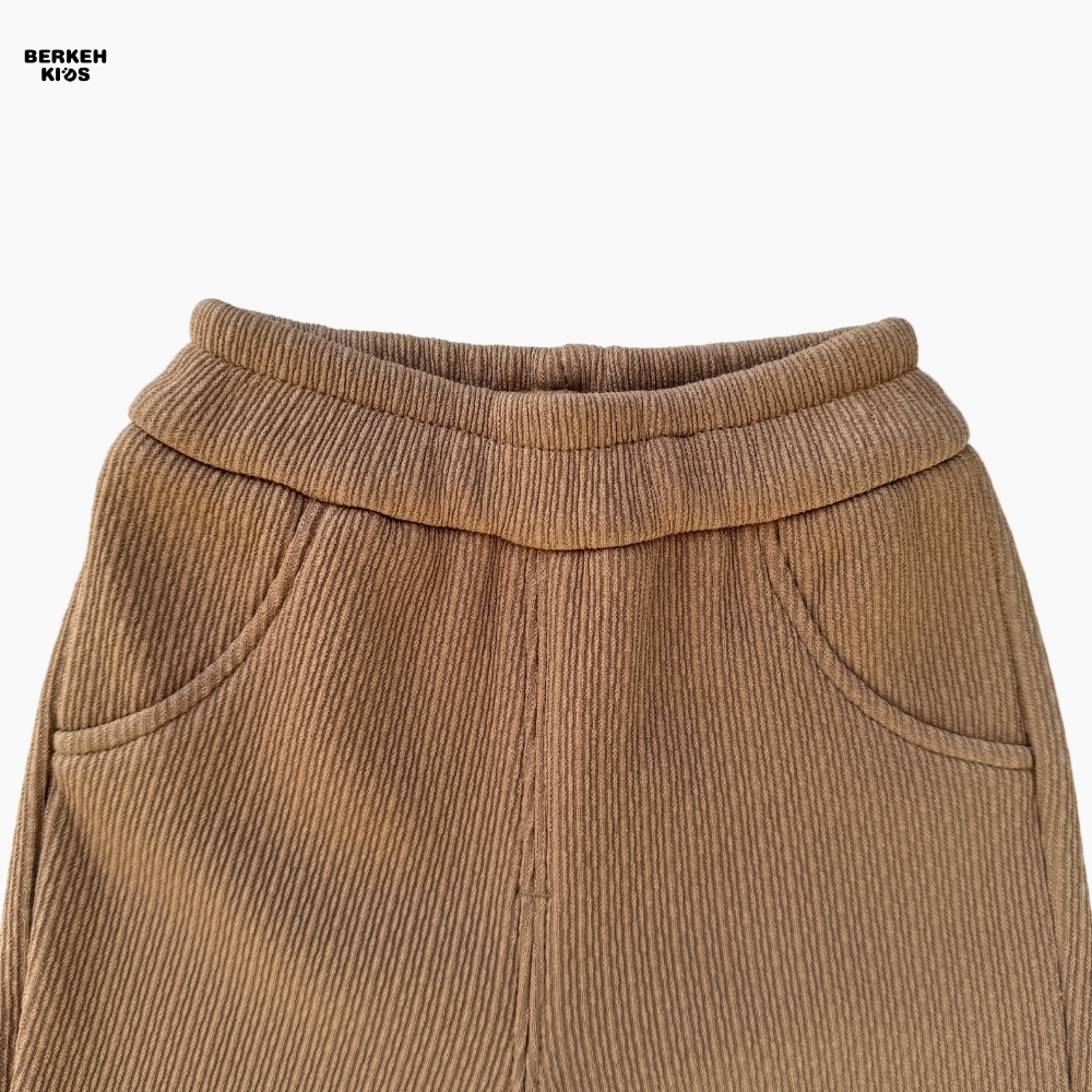 بسیاری از کودکان از زبری لباسهای بافتنی یا پشمی شکایت دارند، اما لایه داخلی این شلوار گرم به قدری نرم و پنبهای است که حس نوازش را به پوست کودک منتقل میکند و کاملاً ضد حساسیت است. در سمت دیگر، رویه شلوار از پارچه مخمل کبریتی وارداتی تولید شده است. بافت راهراه ریز این پارچه، علاوه بر اینکه ظاهری کلاسیک و همیشه مد به لباس میدهد، مقاومت بسیار بالایی در برابر سایش دارد. این یعنی حتی پس از بارها شستشو و بازی کردن کودک در مهدکودک یا پارک، این شلوار پاییزه و زمستانی کیفیت و فرم اولیه خود را حفظ میکند و دچار پرزدهی یا زانو انداختن نمیشود.