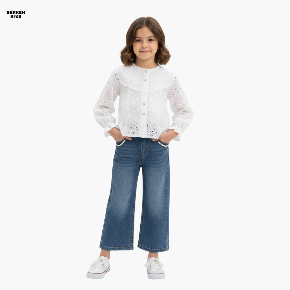 شلوار جین دخترانه آبی روشن مدل بگ مناسب سن ۵ تا ۱۰ سال کد bk33
