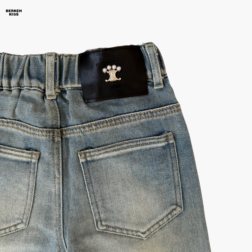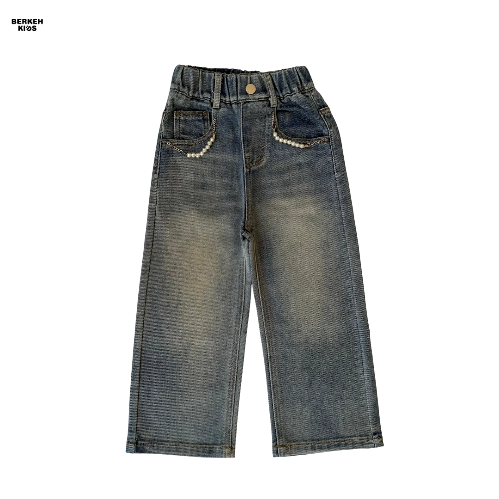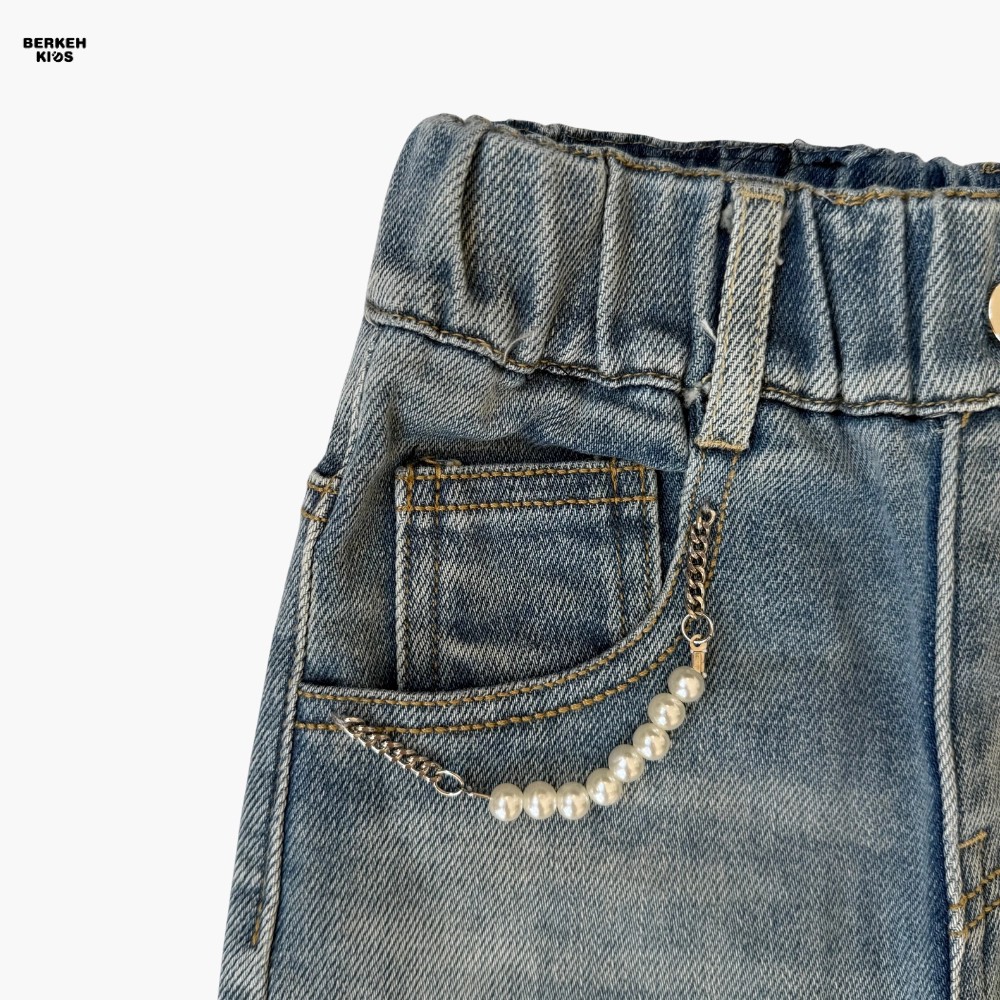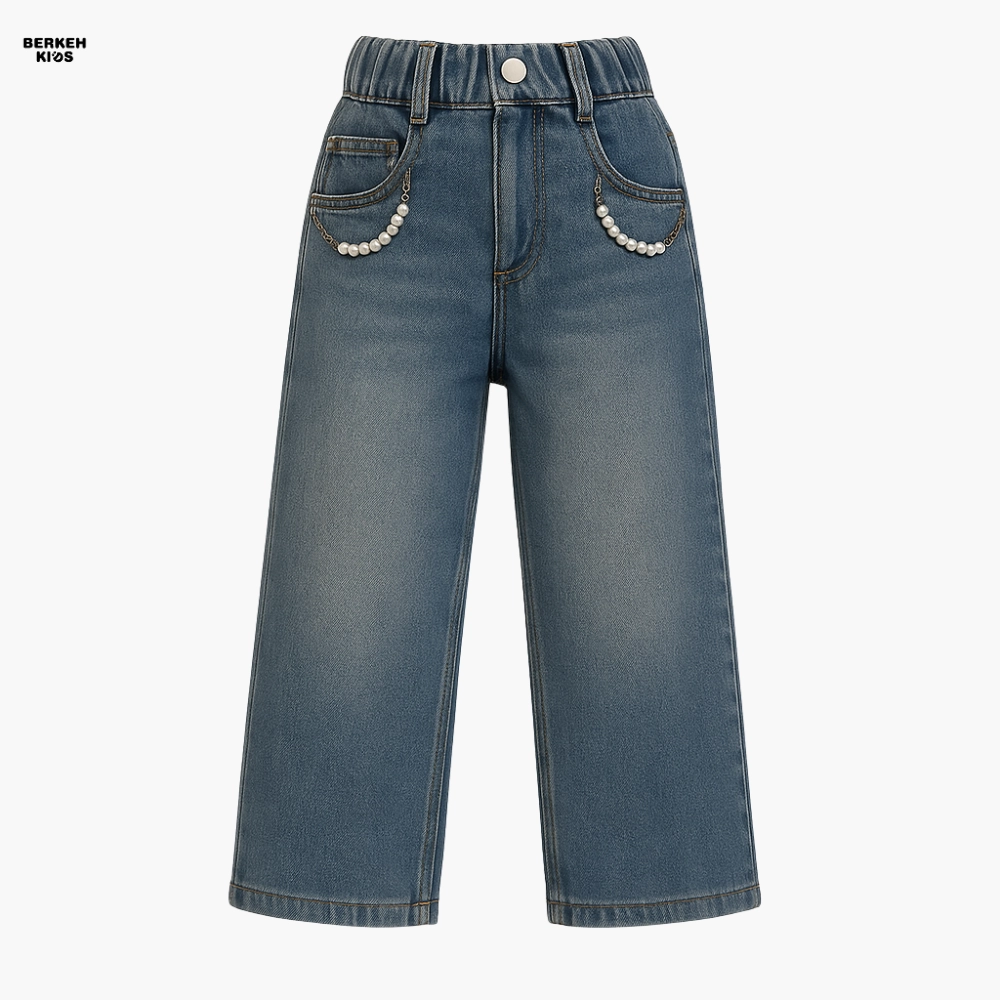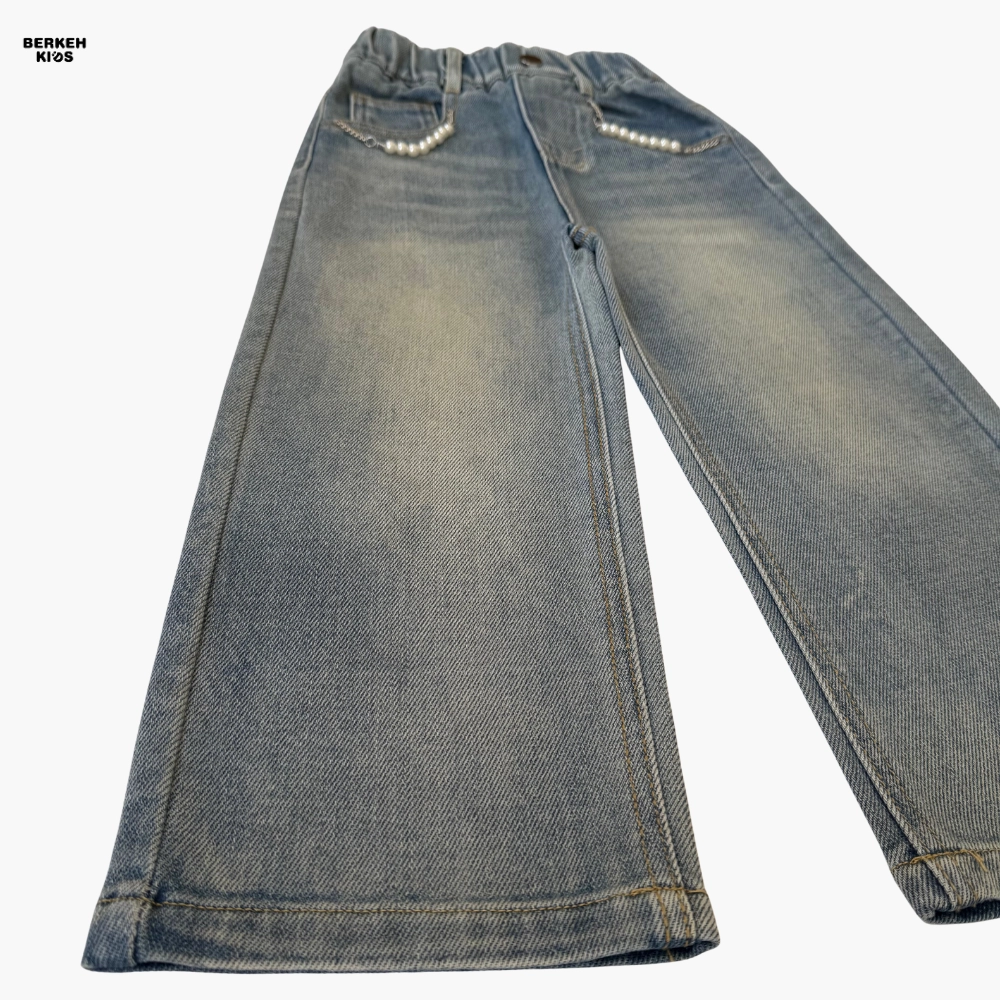 کمر این شلوار کش‌دار طراحی شده تا به‌راحتی پوشیده شود و بدون نیاز به کمربند، به فرم بدن کودک بنشیند. دکمه جلوی کار به همراه جیب‌های تزیین‌شده با مروارید و زنجیر ظریف، جلوه‌ای دخترانه و فانتزی ایجاد کرده‌اند. این جزئیات باعث می‌شوند شلوار جین دخترانه آبی روشن، هم برای استایل روزمره و هم برای موقعیت‌های خاص مانند مهمانی‌ها و جشن‌های کودکانه مناسب باشد.