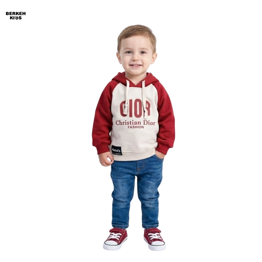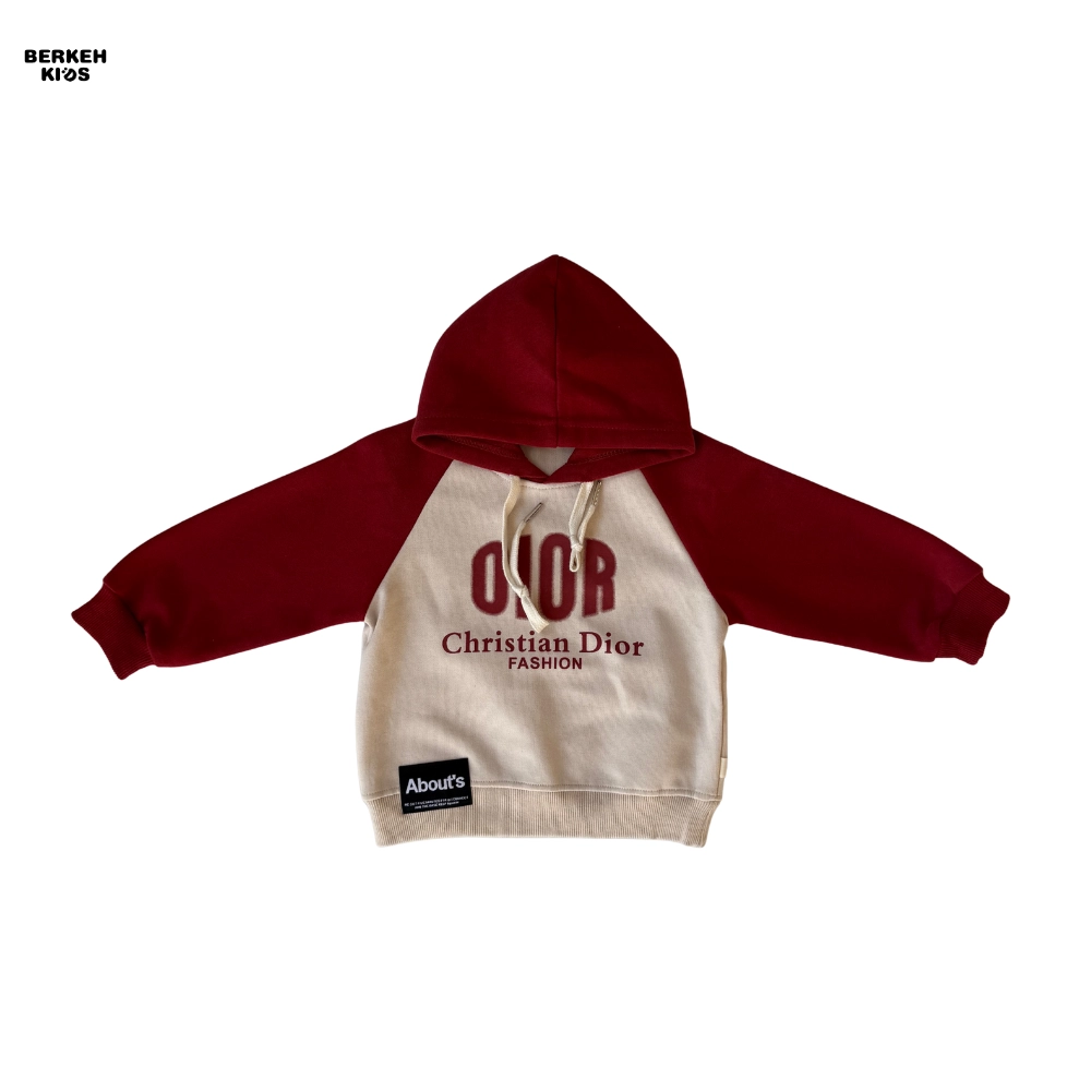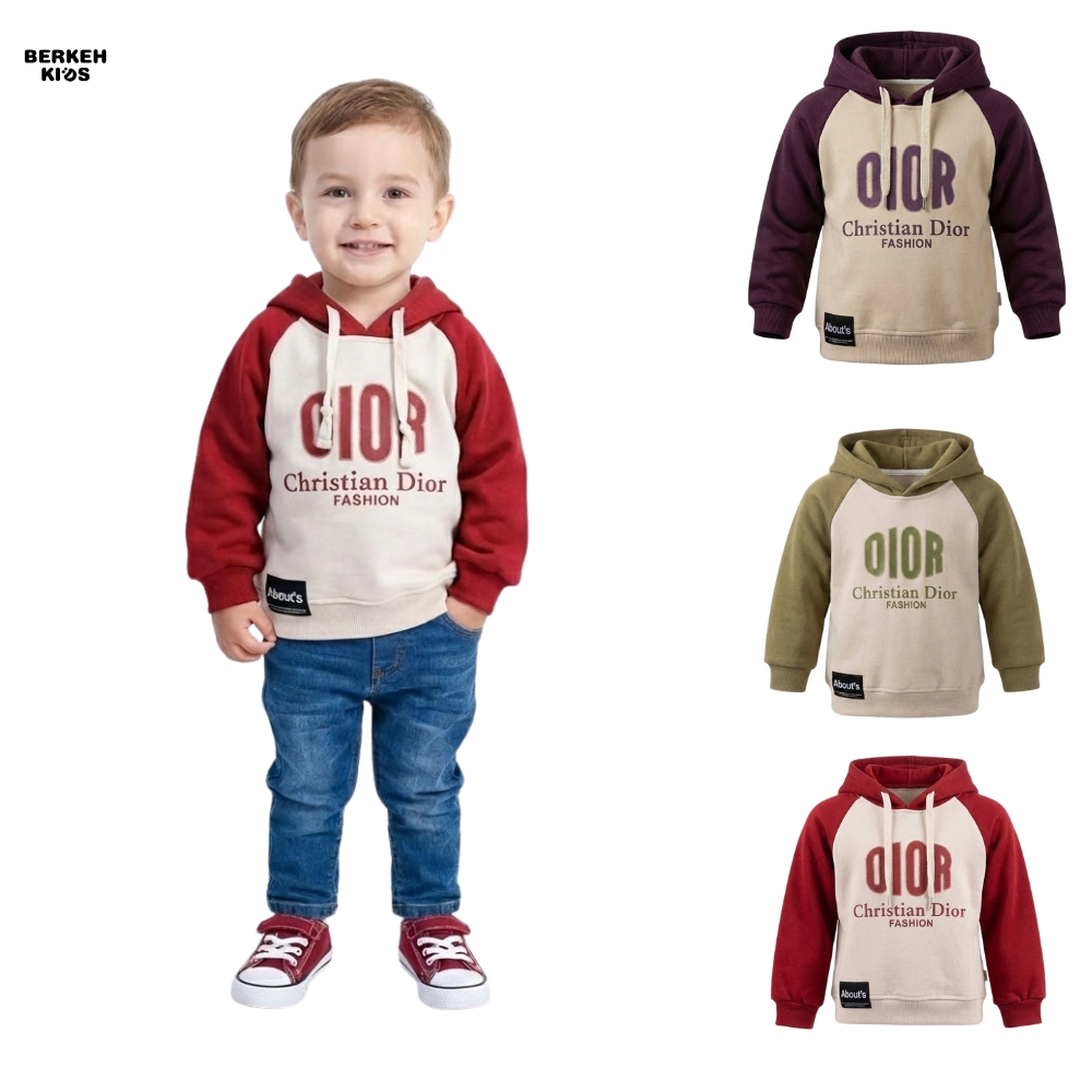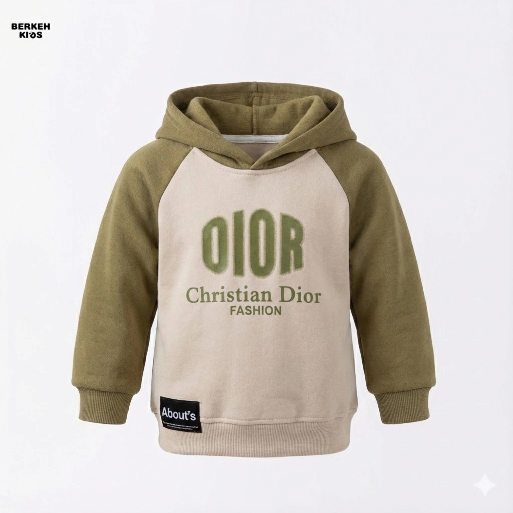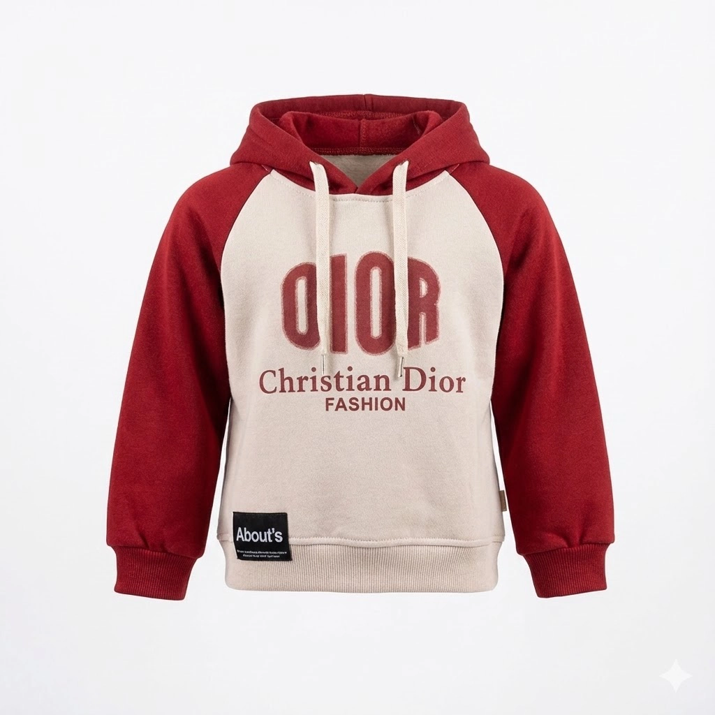 روی سینه این هودی، عبارت “DIOR Christian Dior FASHION” با فونتی زیبا و کیفیتی بالا چاپ شده است. بسیاری از والدین هنگام جستجو در اینترنت از عباراتی مانند “لباس بچه گانه مارک دار” یا “سویشرت طرح برند” استفاده میکنند؛ این محصول به خوبی پاسخگوی سلیقه والدینی است که دوست دارند فرزندشان لباسهایی با طرح برندهای مطرح جهانی بپوشد. وجود بندهای تزیینی روی کلاه و یک تگ کوچک پارچهای با نوشته “About’s” در پایین لباس، جزئیات ظاهری این کار را تکمیل کرده و آن را از مدلهای ساده متمایز میکند.
