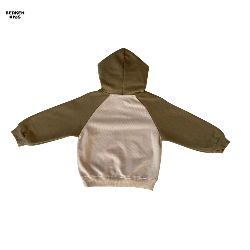 اولین چیزی که در این هودی اسپرت بچگانه پسرانه جلب توجه میکند، طراحی دو رنگ و مدل آستین رگلان آن است. بدنه اصلی هودی بچگانه به رنگ کرم روشن است که با رنگهای گرم و پاییزی مانند زرشکی، سبز زیتونی و بنفش در قسمت آستینها و کلاه ترکیب شده است. این تضاد رنگی، جلوهای بسیار اسپرت و پرانرژی به لباس داده است.