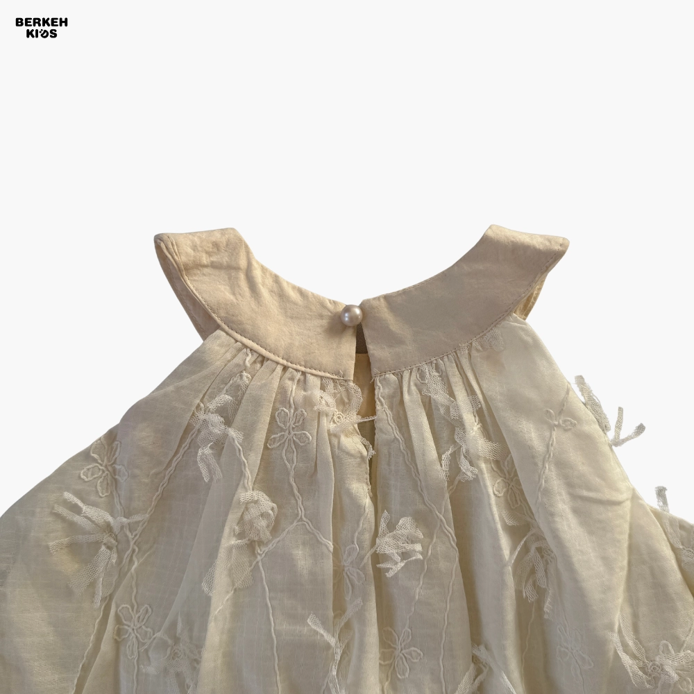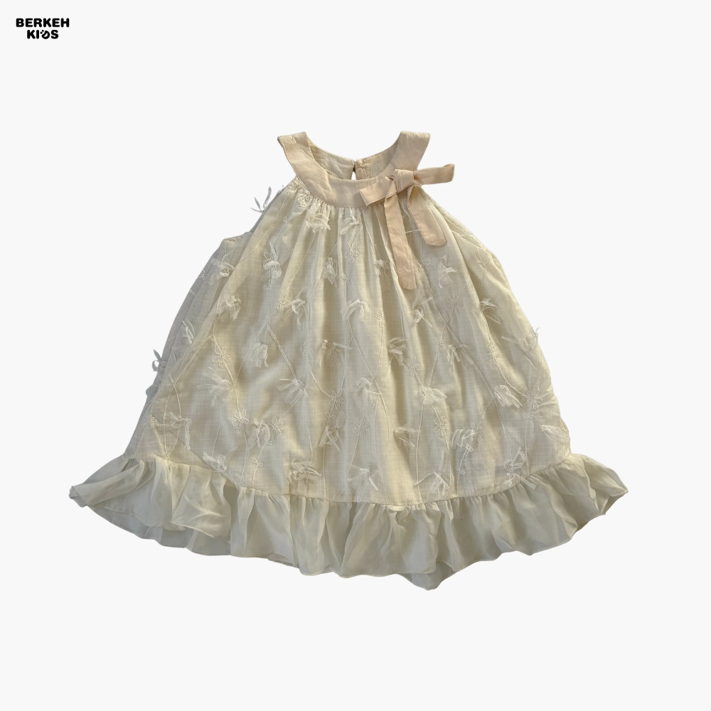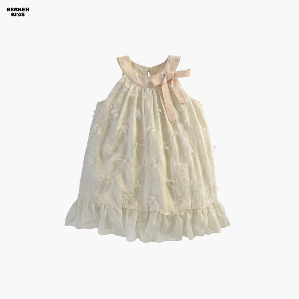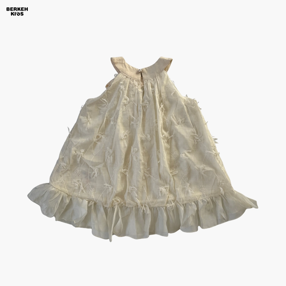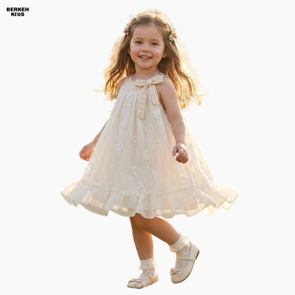 در قسمت پشت لباس، یک دکمه طراحی شده که هم استفاده را راحتتر میکند و هم با ظاهر لباس هماهنگ است. چون بخش یقه ساده و گرد انتخاب شده، این مدل برای کودکانی که در پوشیدن لباسهای یقهدار مشکل دارند، گزینه مناسبتری محسوب میشود. دامن لباس نیز حالت چیندار و سبک دارد و هنگام حرکت کودک، فرم پفی ملایمی ایجاد میکند که ظاهر این پیراهن را بیشتر به مدلهای عروسکی نزدیک کرده است. اگر لباسی میخواهید که در عکسهای آتلیه، جشن تولد یا حتی عروسی جلوه بسیار زیادی داشته باشد، این مدل از نظر طراحی و کیفیت انتخاب بسیار مناسبی است.
