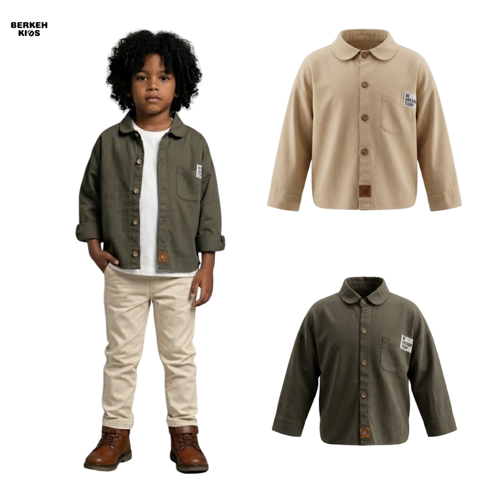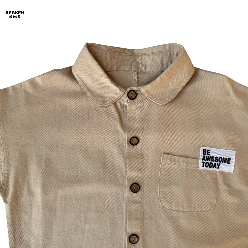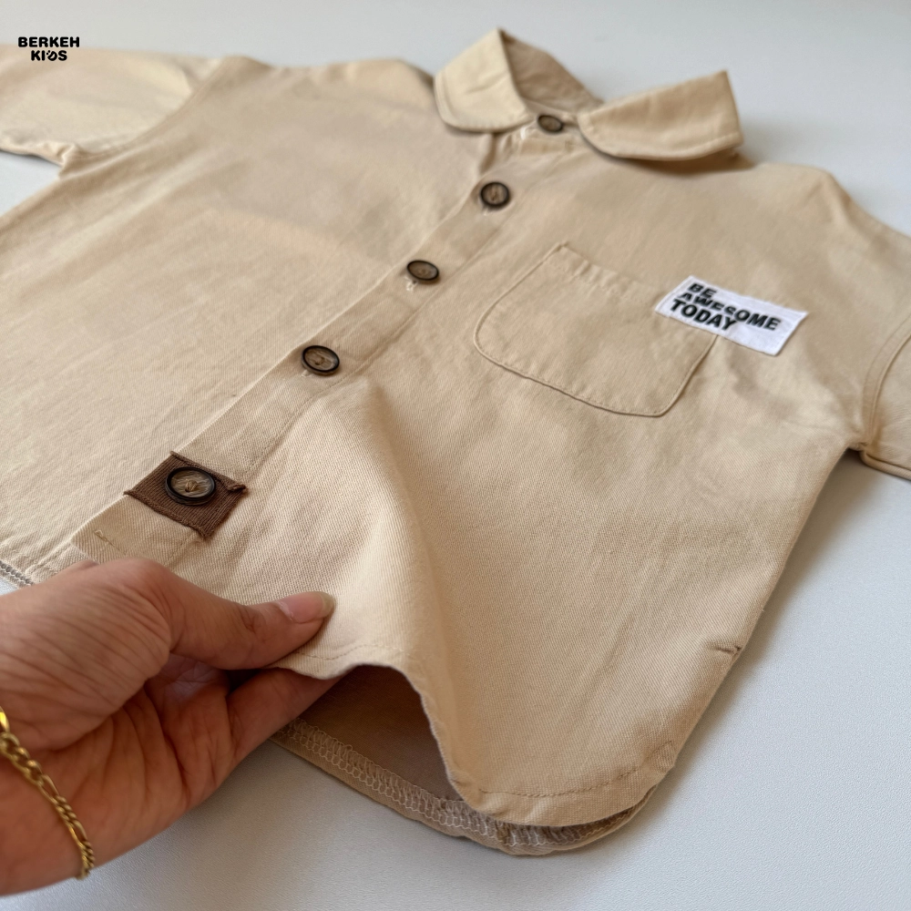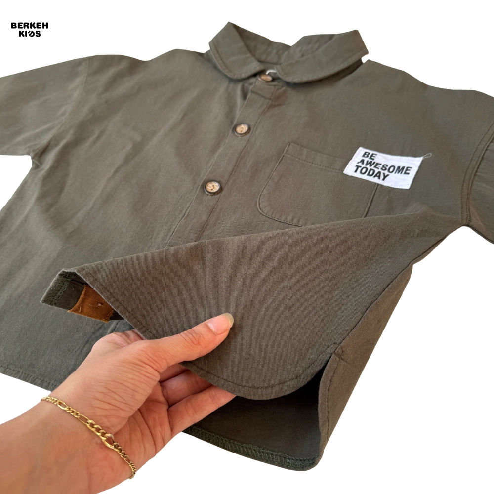 امروزه در دنیای مد و فشن کودکان، استفاده از عبارات مثبت بسیار باب شده است. ظاهر این پیراهن با جزئیات مینیمال و بسیار جذاب تزیین شده است. یقه برگردان (Babe Collar) در کنار دکمههای طرح چوب، جلوهای وینتج و در عین حال مدرن به لباس بخشیده است. اما نقطه قوت طراحی، جیب سمت چپ است که این محصول را به یک بلوز پسرانه با جمله انگیزشی تبدیل کرده است. عبارت انگلیسی “BE AWESOME TODAY” (امروز عالی باش) که روی جیب گلدوزی شده، پیامی مثبت و انرژیبخش دارد که حس اعتماد به نفس را تداعی میکند.