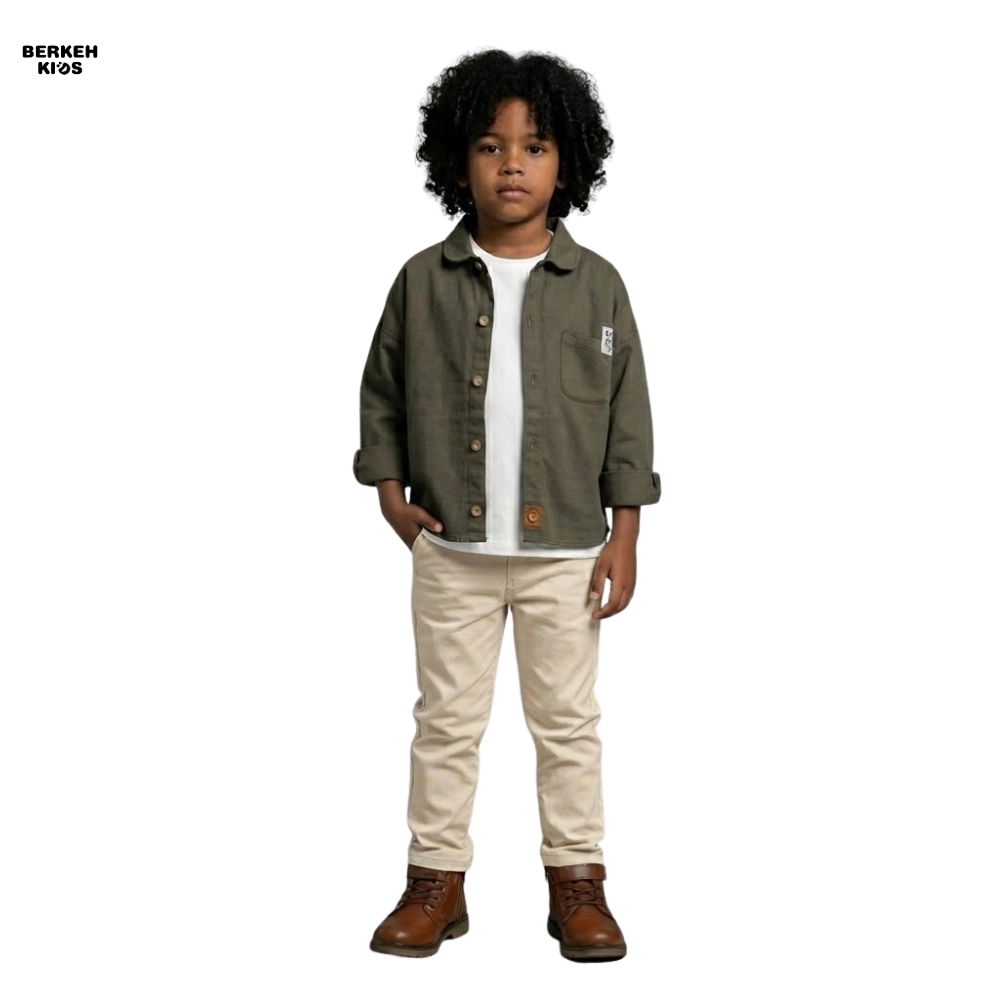 این پیراهن کتان پسرانه بچگانه مدل اسپرت در پالت رنگی خنثی و بسیار پرطرفدار (سبز یشمی تیره و کرم نسکافهای) عرضه شده است. این رنگها در روانشناسی رنگ لباس کودک، نماد طبیعت و آرامش هستند و به راحتی با تمام رنگهای دیگر هارمونی ایجاد میکنند.