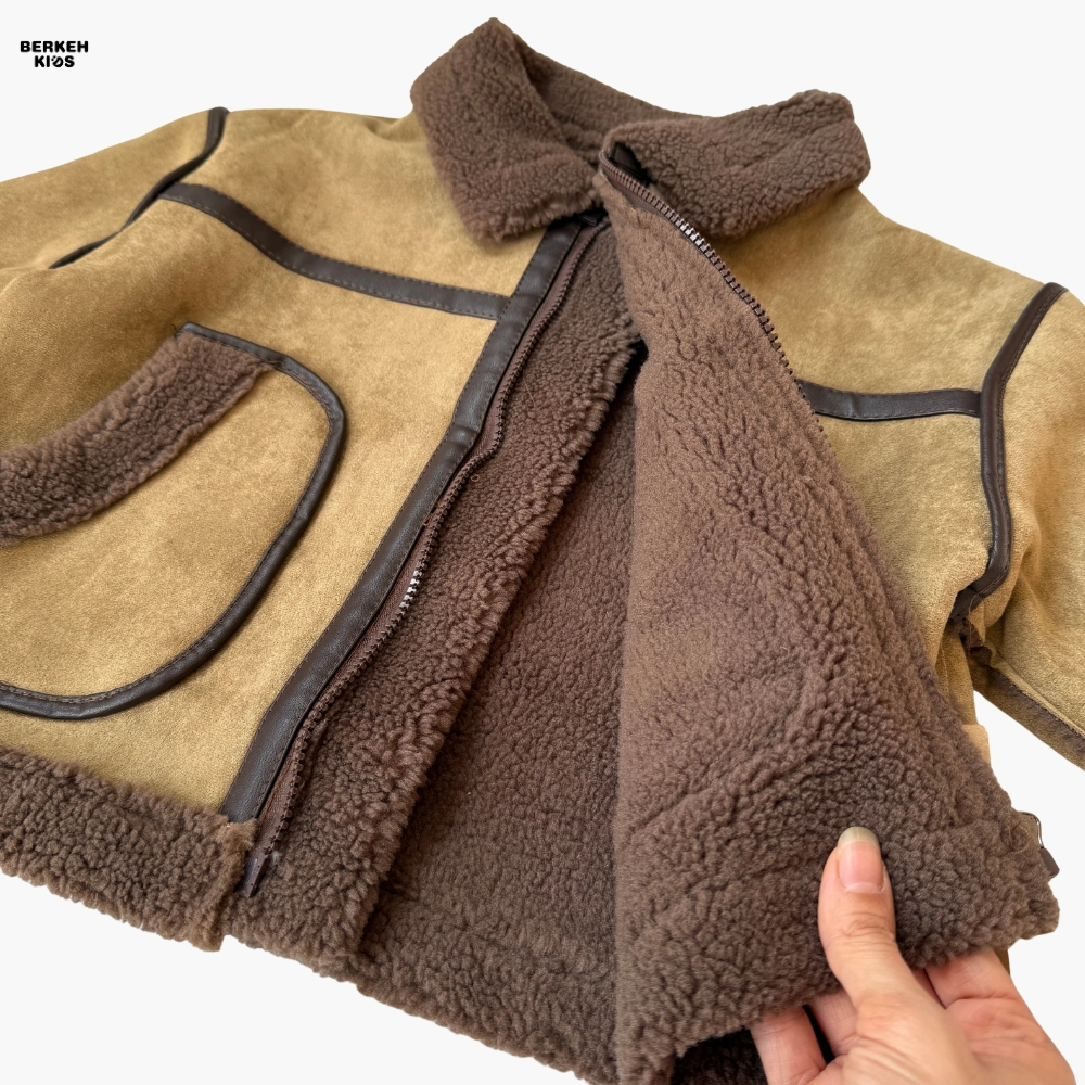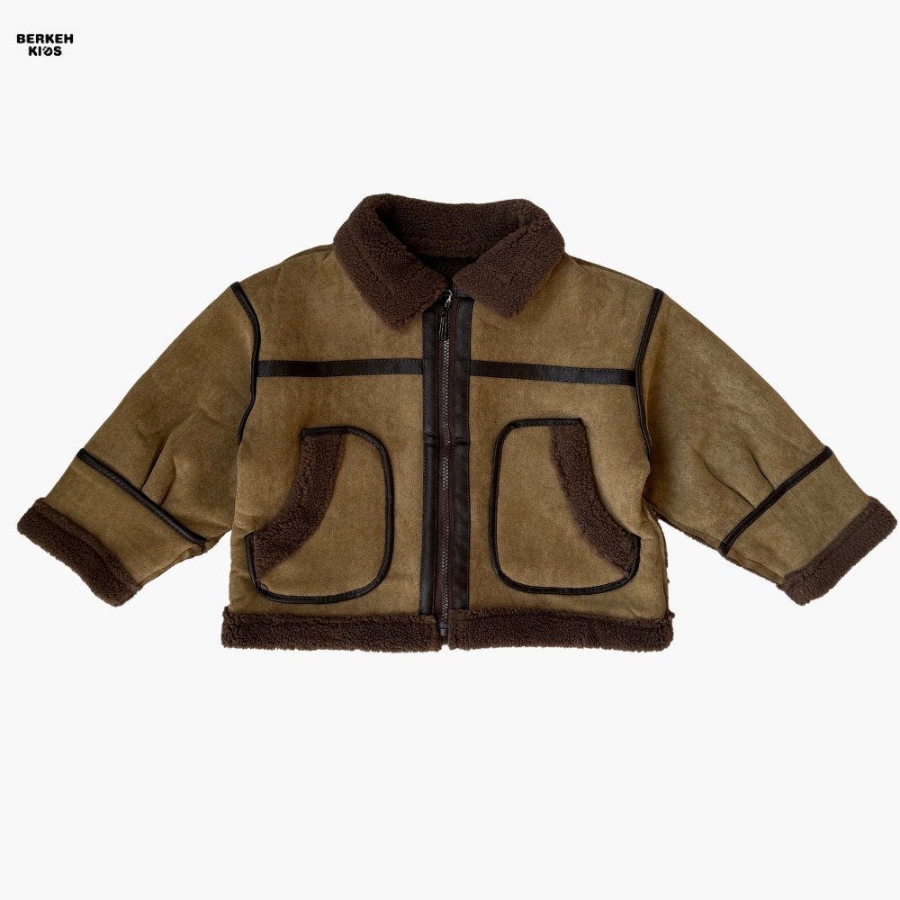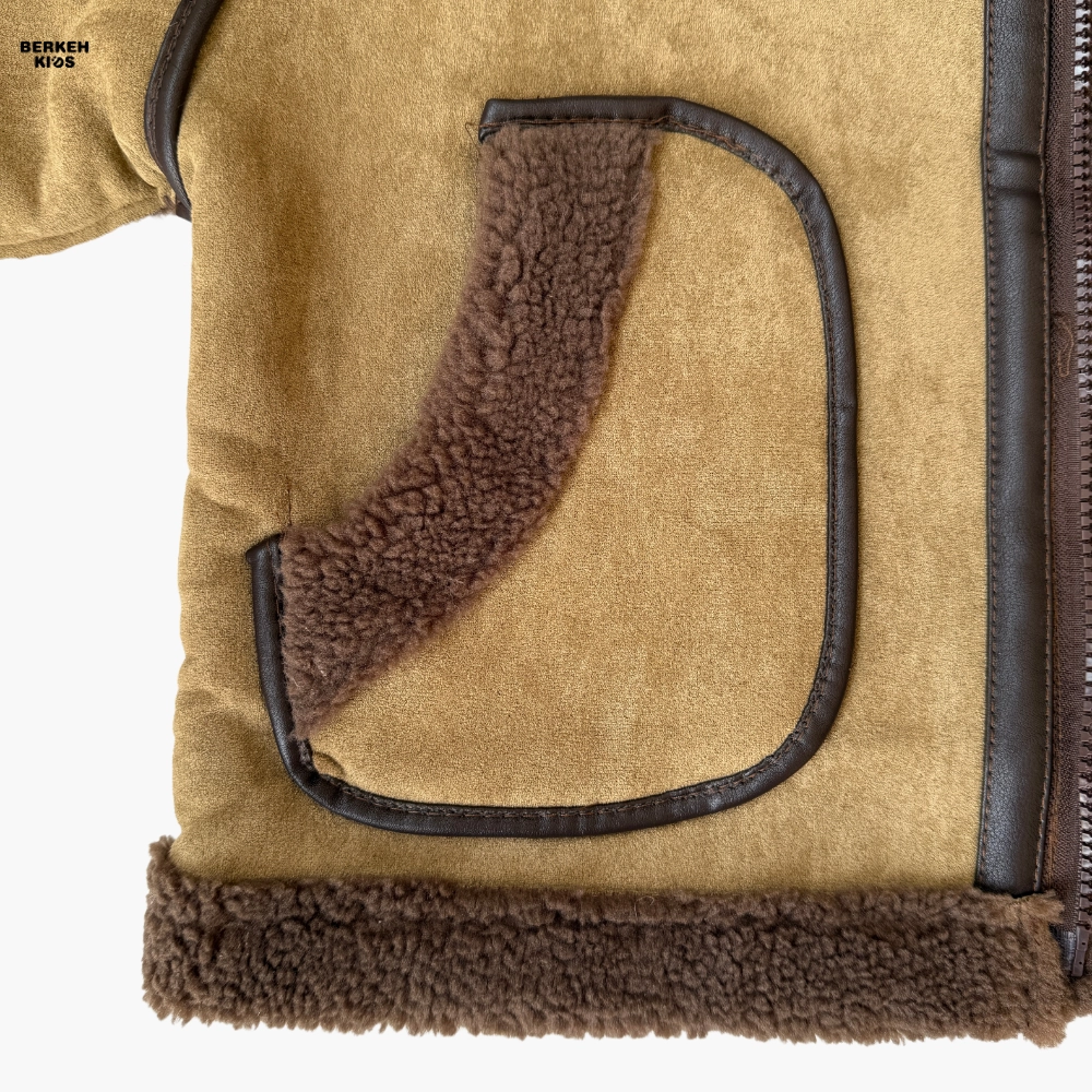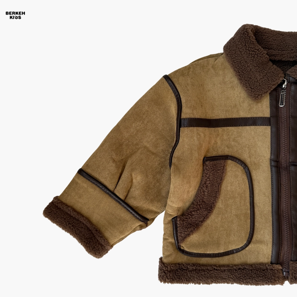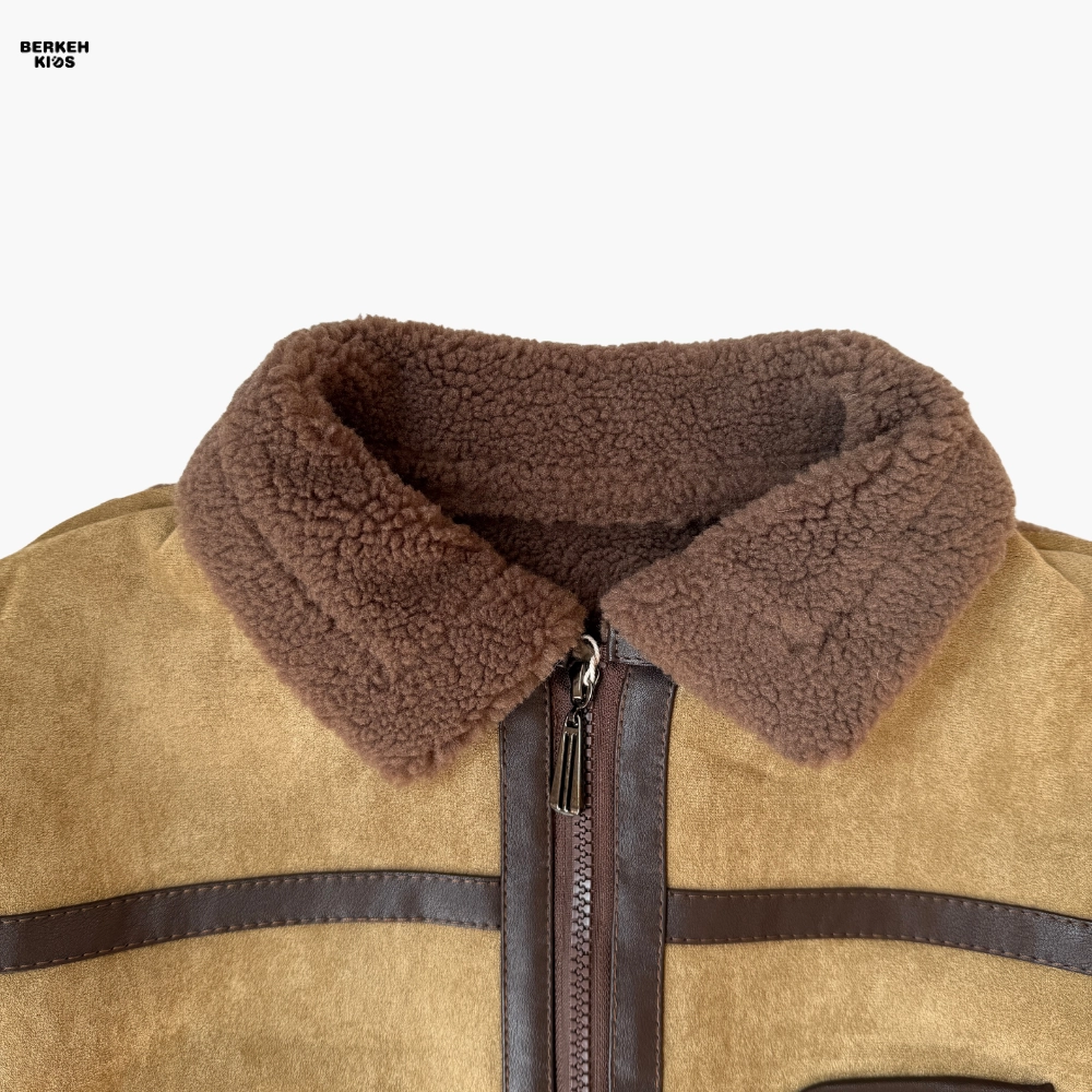 رنگ ترکیبی قهوهای و نسکافهای با دوخت تزئینی و لبههای خزدار، این مدل را از نظر ظاهری خاص و پسرانه کرده است. وجود دو جیب کاربردی بزرگ در جلو، یقه دوبل و زیپ مرکزی مقاوم باعث شده علاوهبر زیبایی، کارایی بالایی هم داشته باشد.