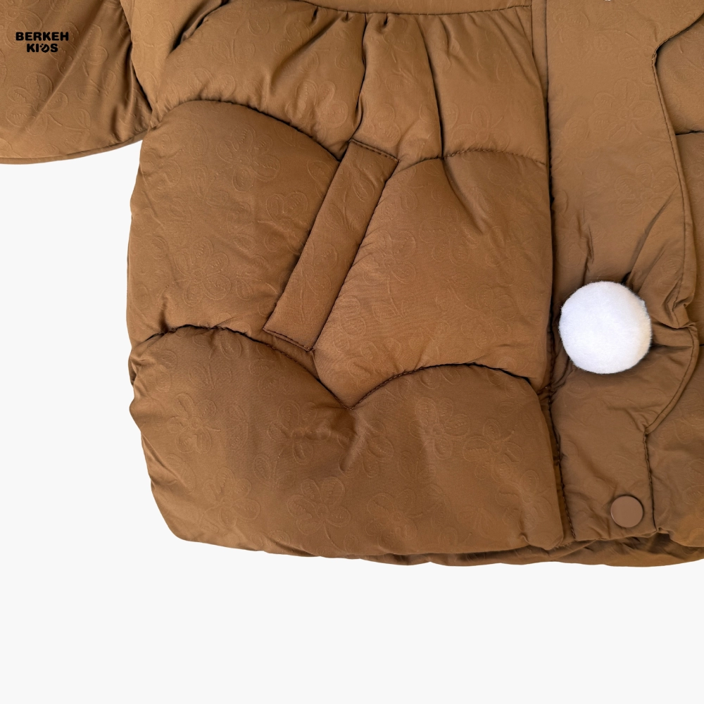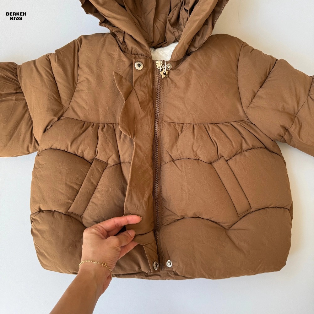 نمای جلو کاپشن دخترانه پفی کلاه دار زمستانی قهوه ای