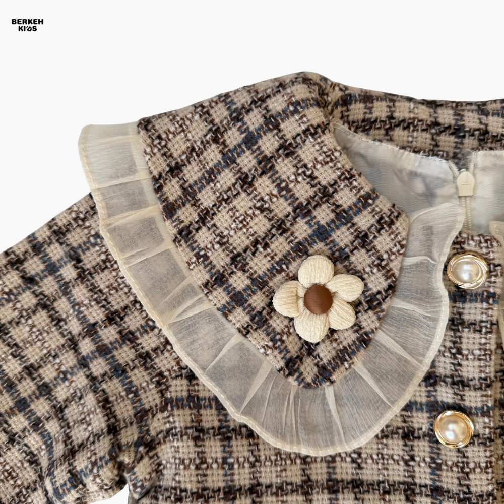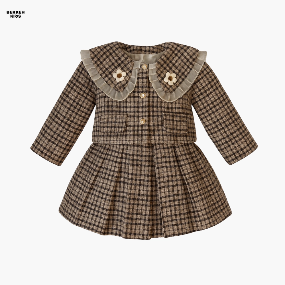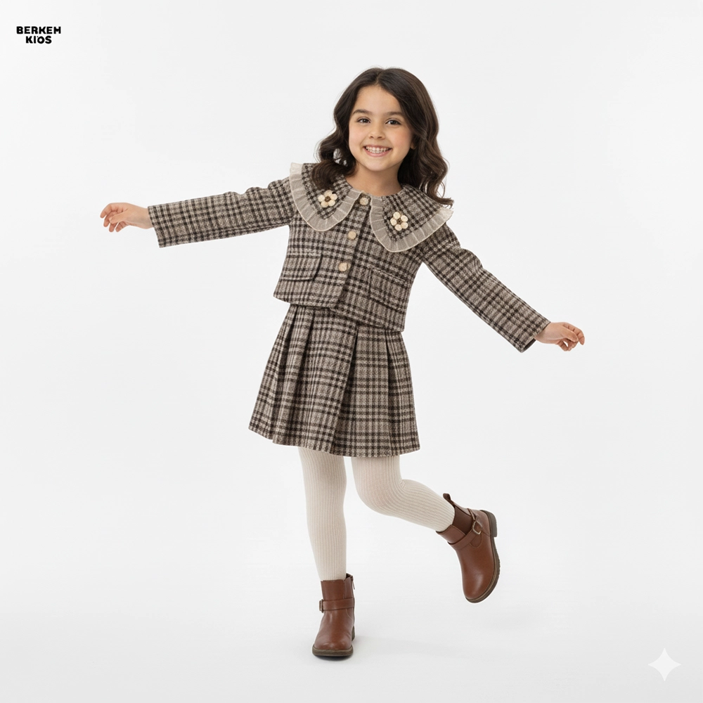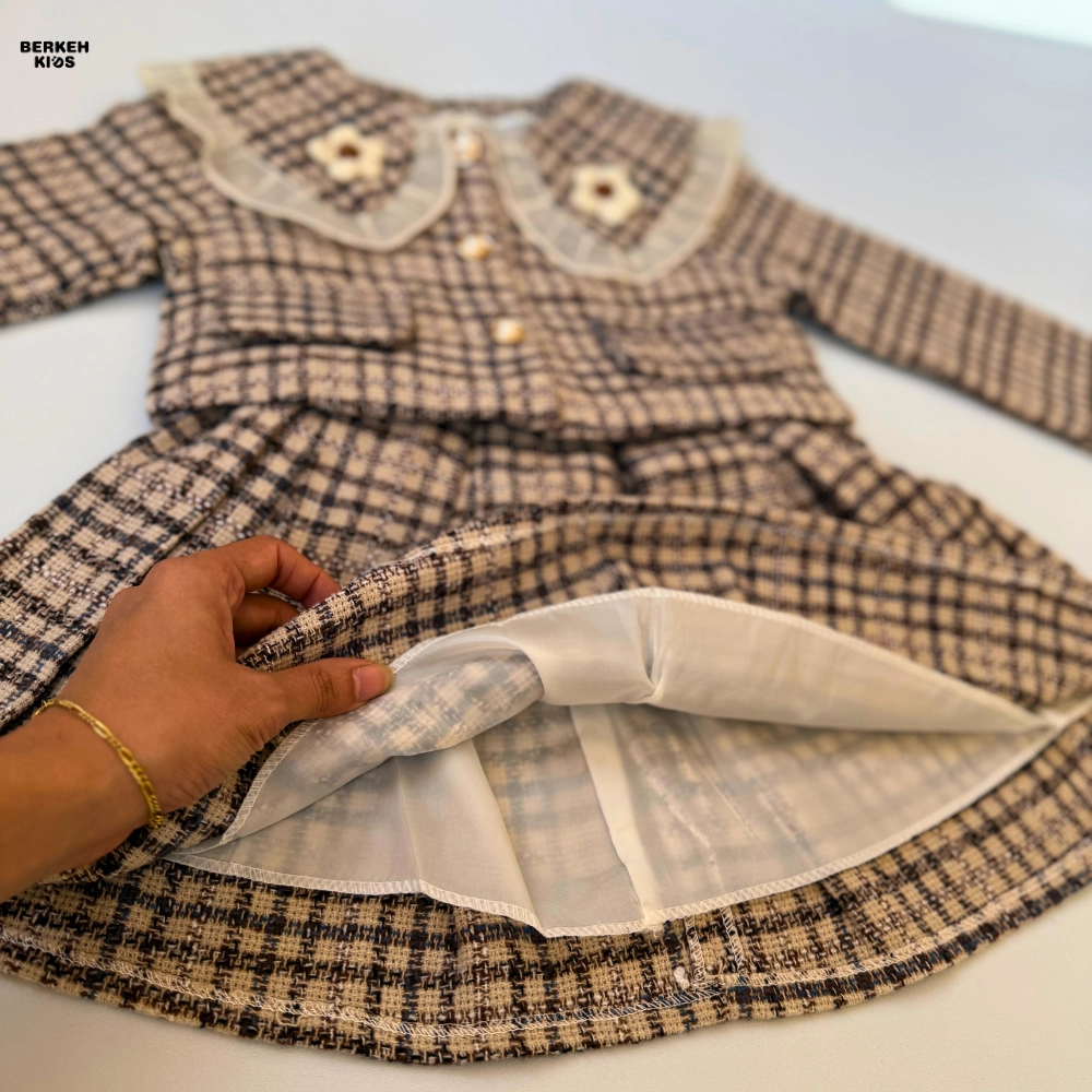 کت و سارافون دخترانه مجلسی پاییزه شیک وارداتی یکی از خاصترین ستهای دو تکه دخترانه برای فصل پاییز و زمستان است که با ترکیب ظرافت طراحی و کیفیت بالا، استایلی دلنشین و مجلسی برای دختران خردسال ایجاد میکند. این مدل شامل یک کت کوتاه چهارخونه و یک سارافون مجلسی است که هر دو از پارچه شنل نرم و گرم دوخته شدهاند. ترکیب رنگ نسکافهای، قهوهای و کرم باعث شده این لباس حس گرمی و لطافت پاییز را منتقل کرده و در عین حال ظاهری لوکس و کودکانه داشته باشد.