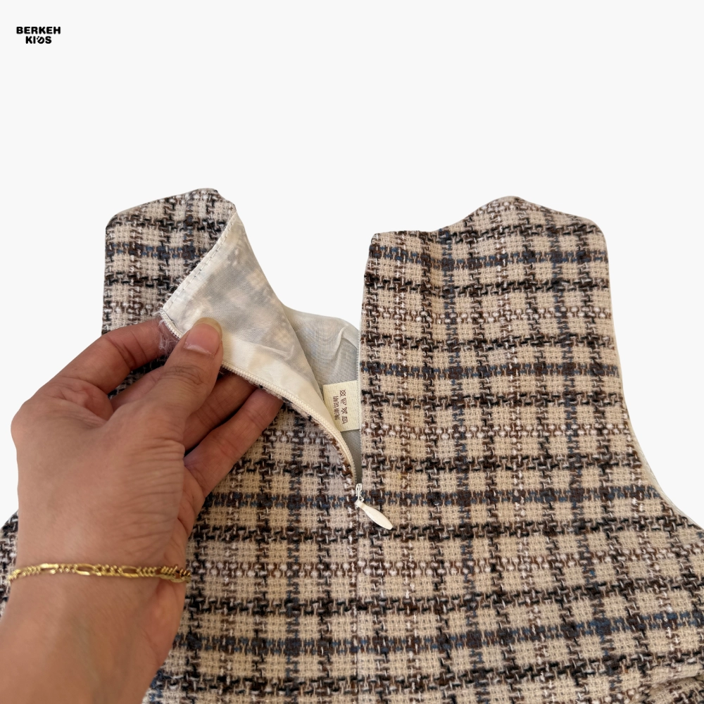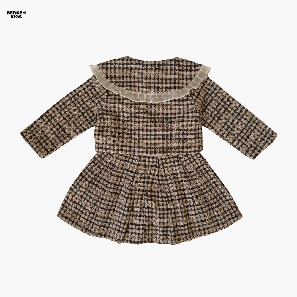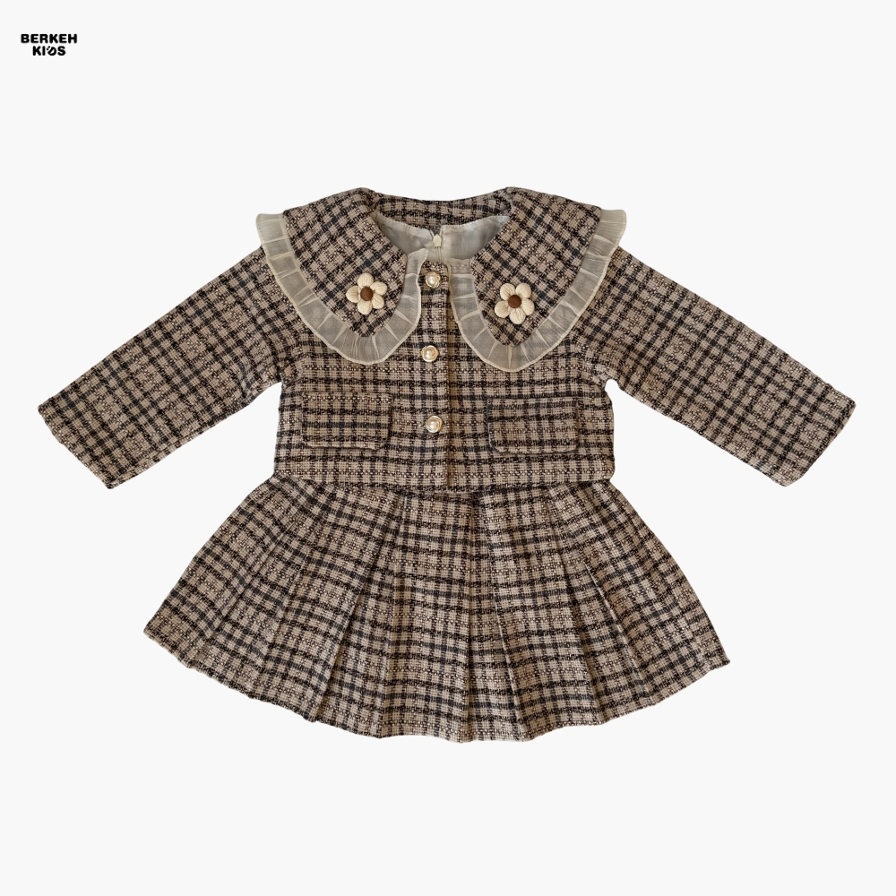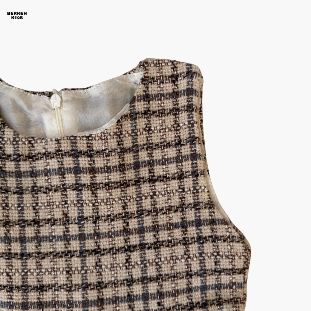 کت و سارافون دخترانه مجلسی پاییزه شیک وارداتی یکی از خاصترین ستهای دو تکه دخترانه برای فصل پاییز و زمستان است که با ترکیب ظرافت طراحی و کیفیت بالا، استایلی دلنشین و مجلسی برای دختران خردسال ایجاد میکند. این مدل شامل یک کت کوتاه چهارخونه و یک سارافون مجلسی است که هر دو از پارچه شنل نرم و گرم دوخته شدهاند. ترکیب رنگ نسکافهای، قهوهای و کرم باعث شده این لباس حس گرمی و لطافت پاییز را منتقل کرده و در عین حال ظاهری لوکس و کودکانه داشته باشد.