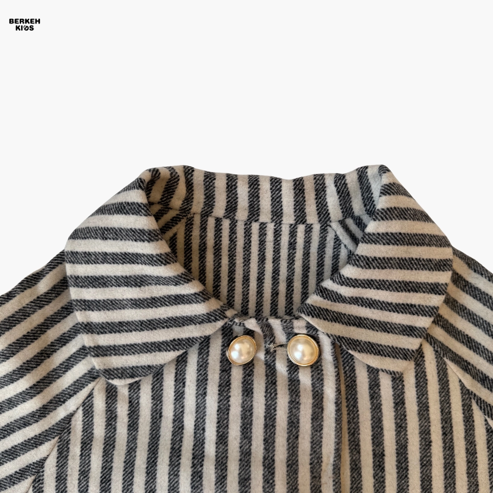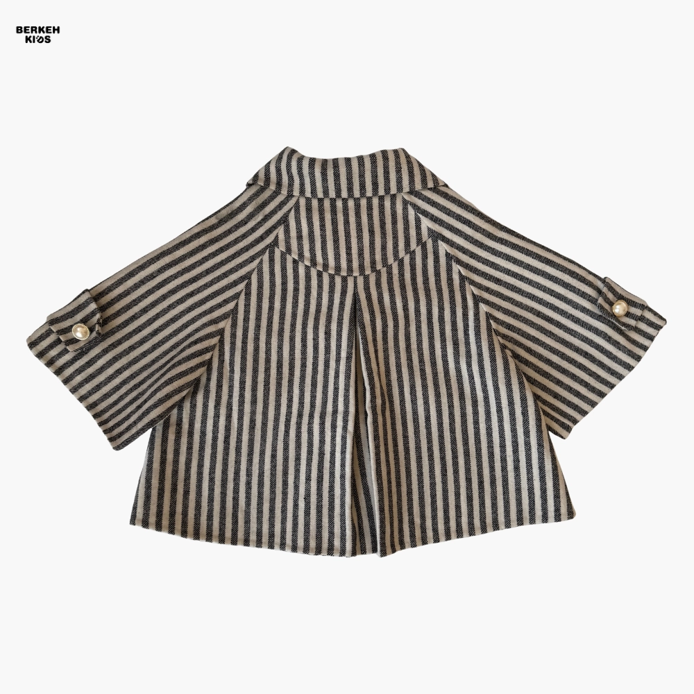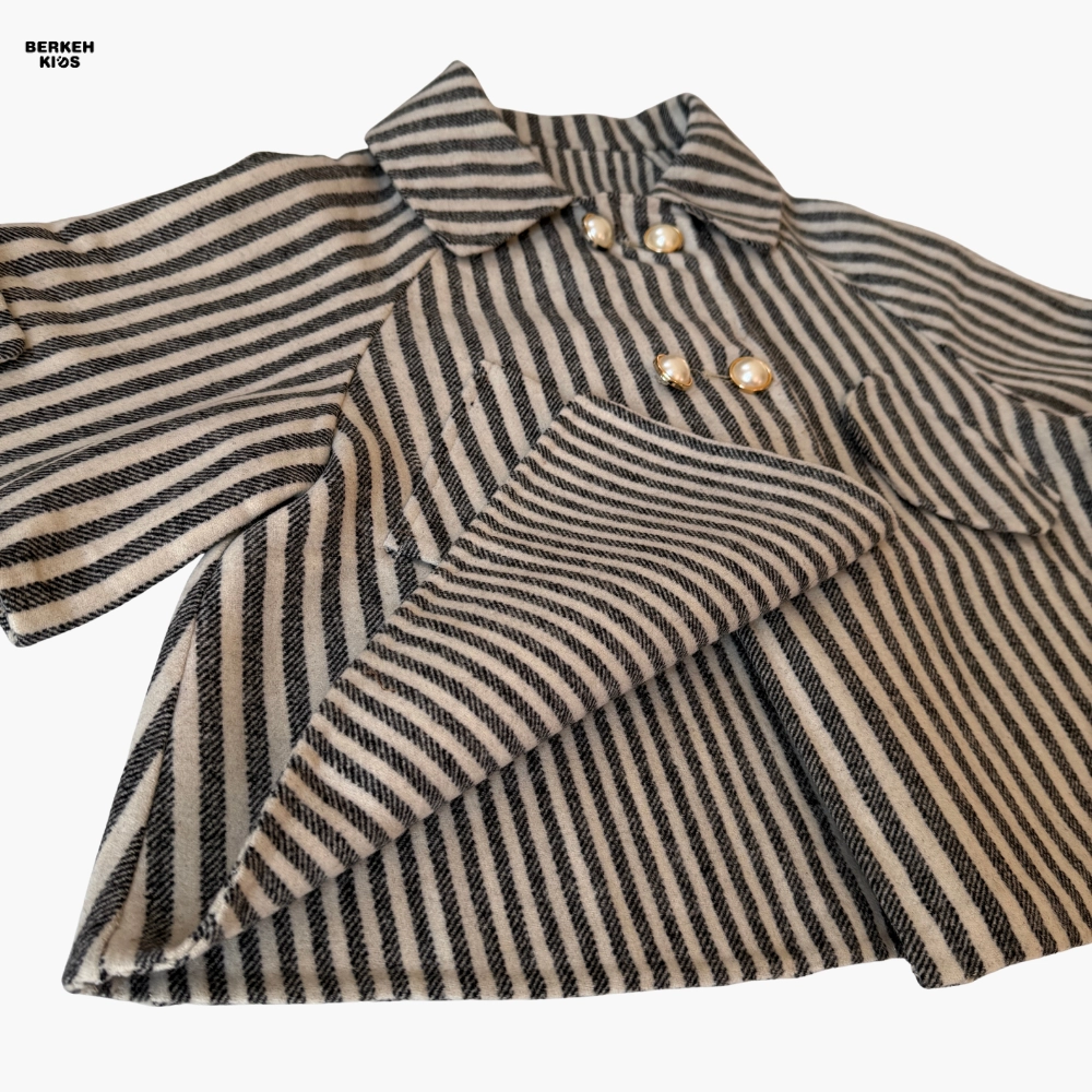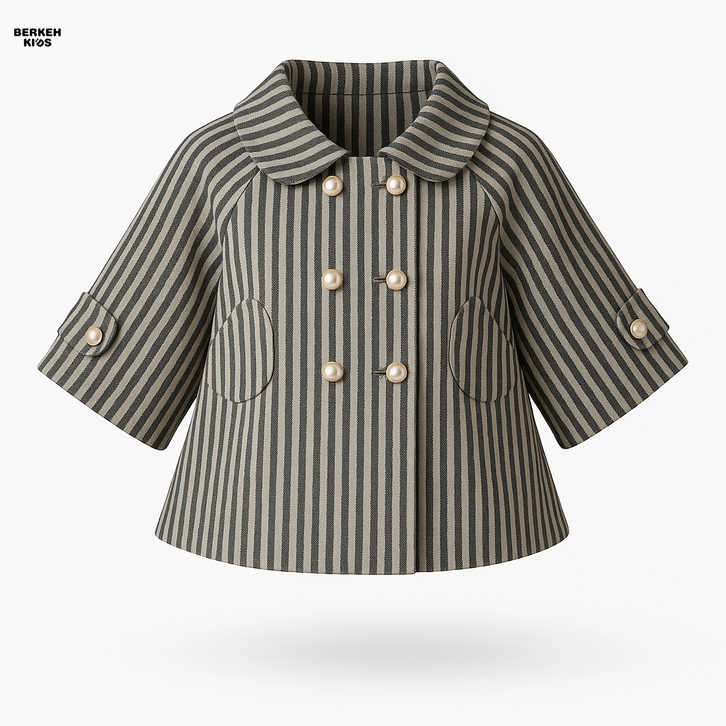 کت پانچ دخترانه ۵ تا ۱۰ سال یکی از مدلهای خاص و پرطرفدار فصل پاییز است که با طراحی پانچدار و برش آزاد، راحتی و استایل را همزمان فراهم میکند. این کت با پارچهای ضخیم، نرم و خوش دوخت تهیه شده و دکمههای مرواریدی روی آن جلوهای کلاسیک و شیک ایجاد کردهاند. طرح راهراه عمودی لباس باعث میشود استایل کودک مرتبتر و قد او کشیدهتر دیده شود.